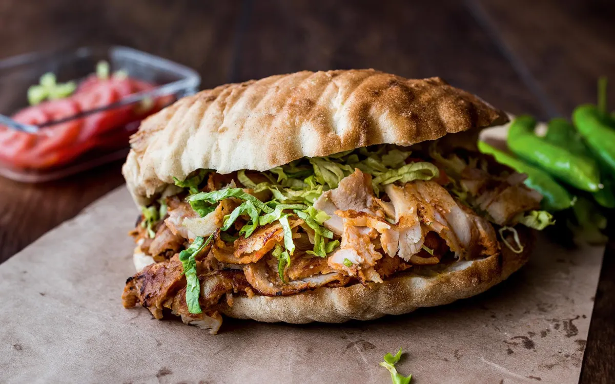 Salami, ham, kip, pita, kebab, sambal en uien.
