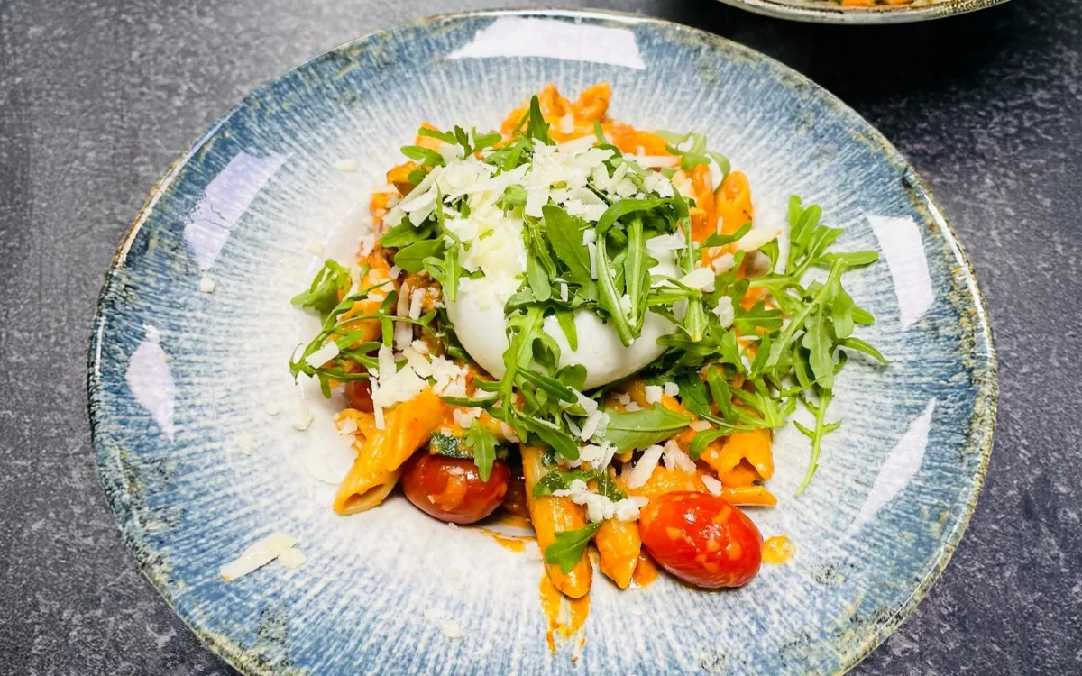Gemengde salade, gegrilde courget, gedroogde tomaten, burrata, parmaham, olijvenolie, balsamico